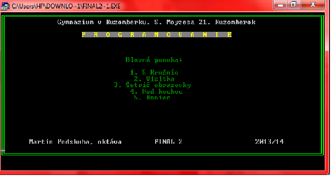 Program Final 2 slúži na vykresľovanie kružníc, výpočet hodu kockou s následným vykreslením grafu, šetrič obrazovky a taktiež sa v ňom nachádza vizitka autora.