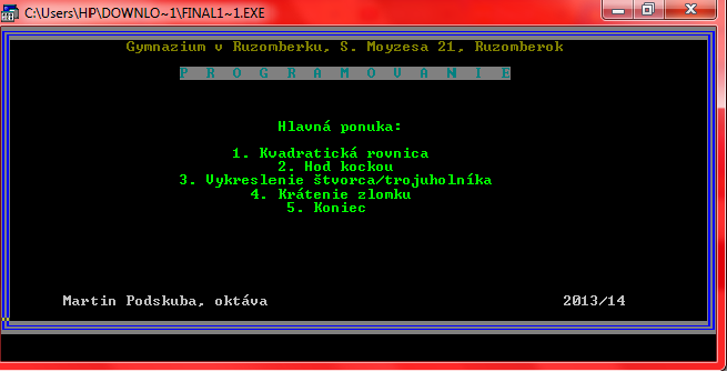 Program Final 1 slúži na výpočet kvadratickej rovnice, vyhodnotenie hodu kockou, vykreslenie štvorca/trojuholníka a krátenie zlomkov.
